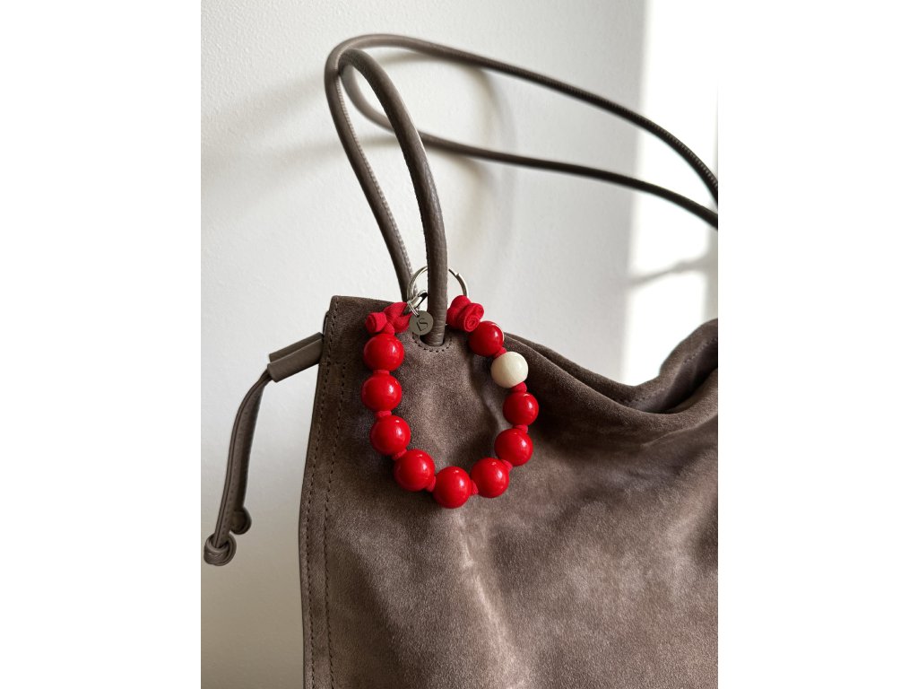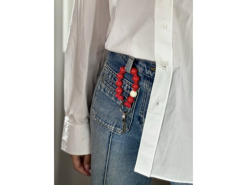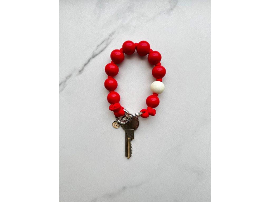 Klíčenka z velkých červených dřevěných korálků s bílým detailem na červené šňůrce, doplněná kvalitní kovovou karabinou pro snadné připnutí. Stylový doplněk nejen na klíče,ale taky jako ozdoba kabelky, batohu, kufru nebo bundy či džínů.